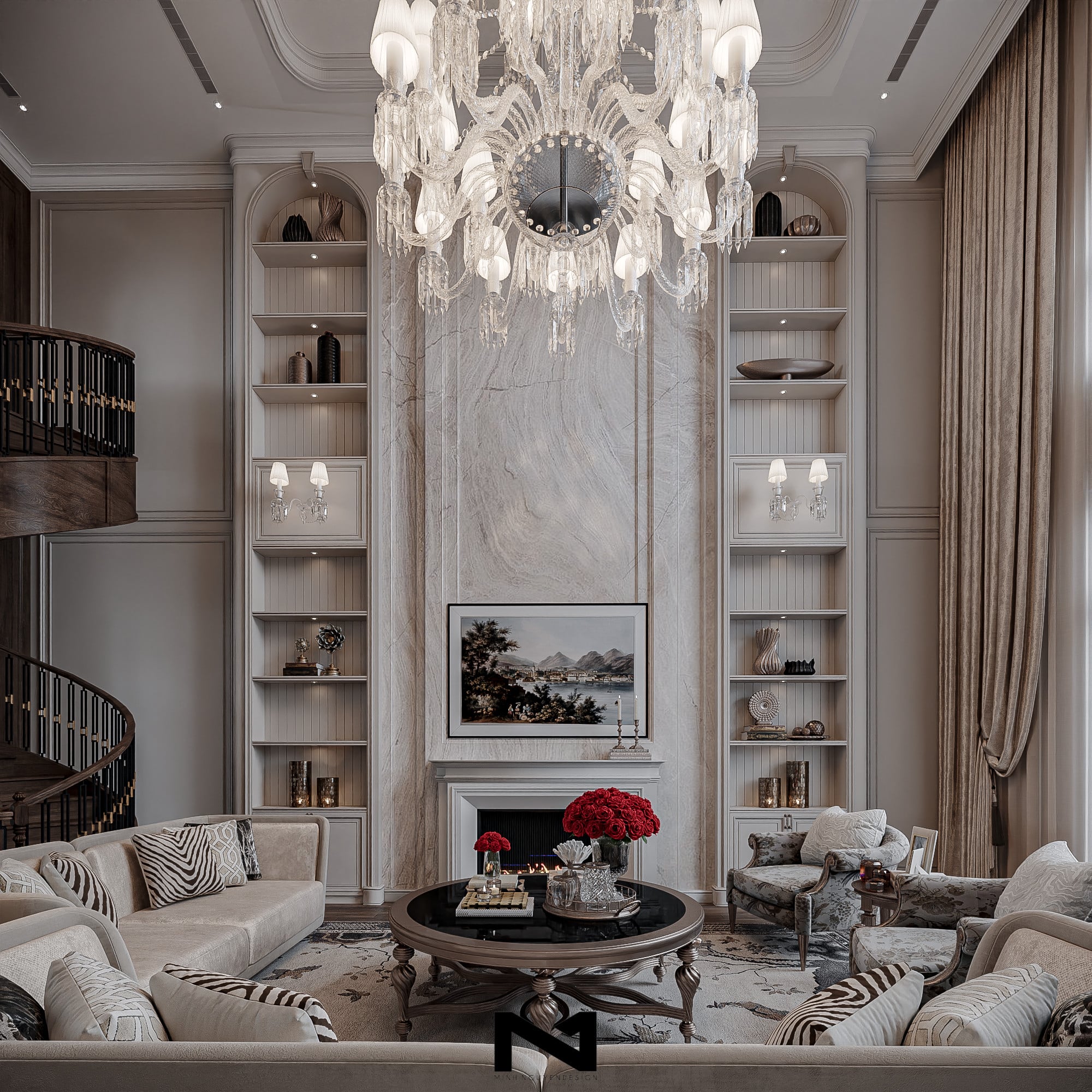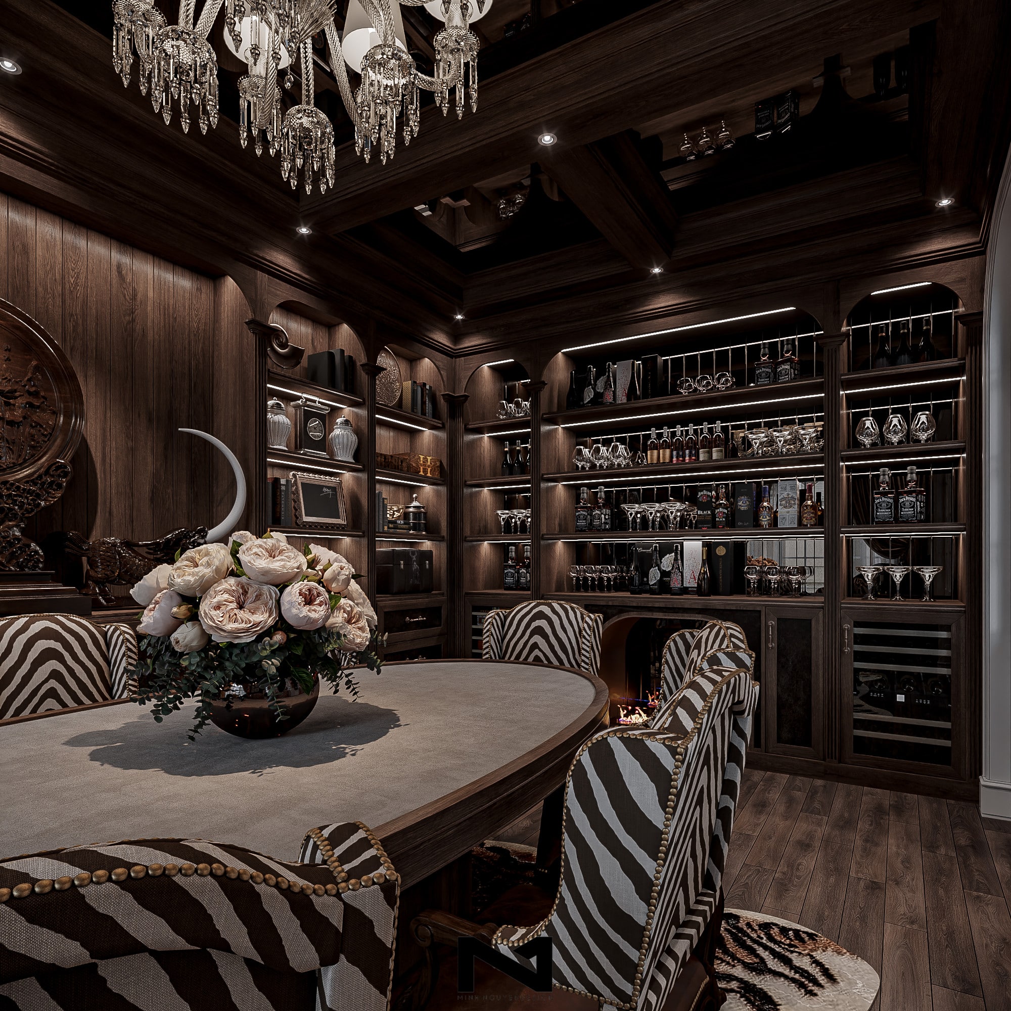 Không gian phòng khách với màu trắng kem chủ đạo, nội thất được thiết kế theo phong cách cổ điển sang trọng, nổi bật với bộ đèn chùm sang trọng tại vị trí khoảng thông tầng. Phòng rượu liên thông đem tới cảm xúc trái ngược, mạnh mẽ, bí ẩn cùng tone màu nâu trầm của nội thất gỗ.